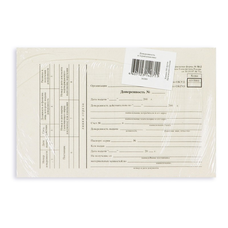 Бухгалтерские бланки — доверенность, типовая форма М-2. Удостоверяют право сотрудника организации получать материальные ценности по договору, заказу, наряду, соглашению, счету. Бланки отпечатаны на офсетной бумаге формата А5, склеены по 100 штук в виде книжки. В комплекте 5 книжек, упакованных в термоусадочную пленку.