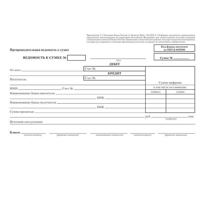 Бухгалтерские бланки — препроводительная ведомость денежной наличности. Сопровождают инкассаторские операции, фиксируют передачу денег в банк. Бланки отпечатаны на офсетной бумаге формата А5. В комплекте 99 штук, склеенных в виде книжки. Упакованы в термоусадочную пленку.