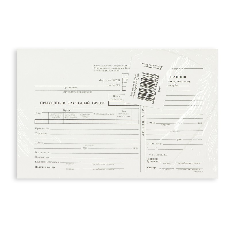 Бухгалтерские бланки — приходный кассовый ордер, унифицированная форма КО-1. Применяются для учета и оформления кассовых операций на предприятии. Бланки отпечатаны на офсетной бумаге формата А5. В комплекте 100 штук, склеенных в виде книжки. Упакованы в термоусадочную пленку.