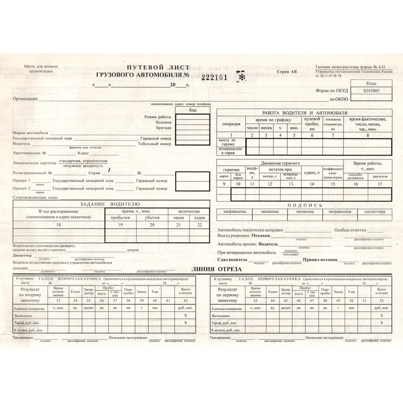 Бухгалтерские бланки — номерной путевой лист грузового автомобиля, типовая форма 4-П. Применяются при повременной оплате грузоперевозок. Бланки отпечатаны на газетной бумаге формата А4. В комплекте 100 штук, склеенных в виде книжки. Упакованы в термоусадочную пленку.