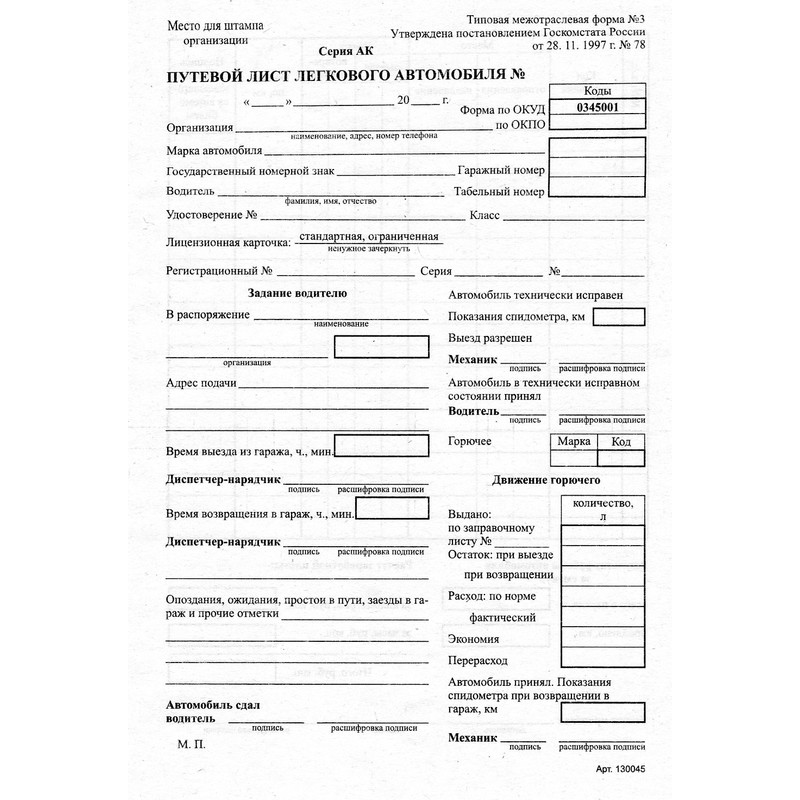 Бухгалтерские бланки — путевой лист легкового автомобиля, типовая межотраслевая форма №3. Применяются в процессе организации перевозок грузов и пассажиров. Бланки отпечатаны на офсетной бумаге формата А5. В комплекте 100 штук, склеенных в виде книжки. Упакованы в термоусадочную пленку.