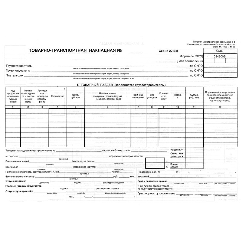 Бухгалтерские бланки — товарно-транспортная накладная, типовая межотраслевая форма 1-Т. Применяются для учета движения товарно-материальных ценностей при перевозке автомобильным транспортом. Бланки отпечатаны на офсетной бумаге формата А4. В комплекте 100 штук, склеенных в виде книжки. Упакованы в термоусадочную пленку.