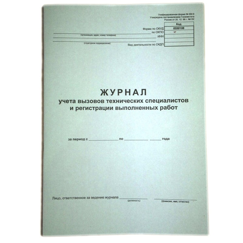 Журнал вызова технических специалистов (формат А4). Обложка изготовлена из картона белого цвета. Внутренний блок — газетная бумага, 24 листа, крепится к обложке с помощью скрепок.