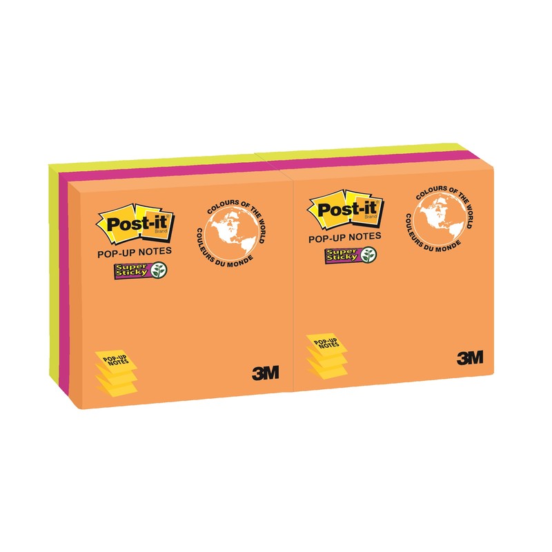 Бумага для заметок с клейким краем Post-it Super Sticky подходит для установки в любые Z-диспенсеры. Размер стикеров — 76×76 мм, 3 цвета, неоновый тон. Плотность бумаги — 90 г/кв.м, клейкость составляет 57 Н/м. В упаковке 6 блоков по 90 листов.