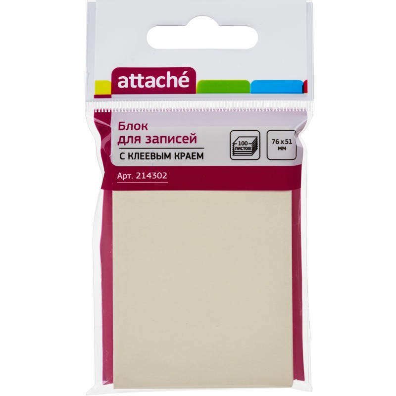 Бумага для заметок с клейким краем Attache. Размер — 76×51 мм, пастельная, желтого цвета. Плотность бумаги составляет 62 г/кв.м, клейкий слой — 18 Н/м. В упаковке 100 листов. После удаления бумаги на поверхности не остается следов клеевого состава, лист можно крепить повторно.