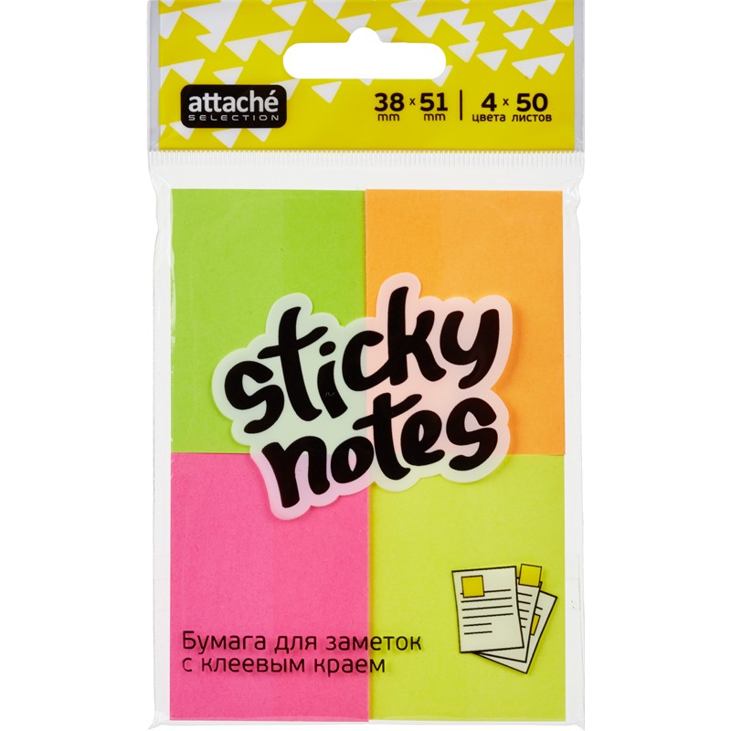 Бумага для заметок с клейким краем Attache. Размер — 38×51 мм, неоновая, 4 цвета. Плотность бумаги составляет 75 г/кв.м, клейкий слой — 20 Н/м. В упаковке 4 блока по 50 листов. После удаления бумаги на поверхности не остается следов клеевого состава, лист можно крепить повторно.