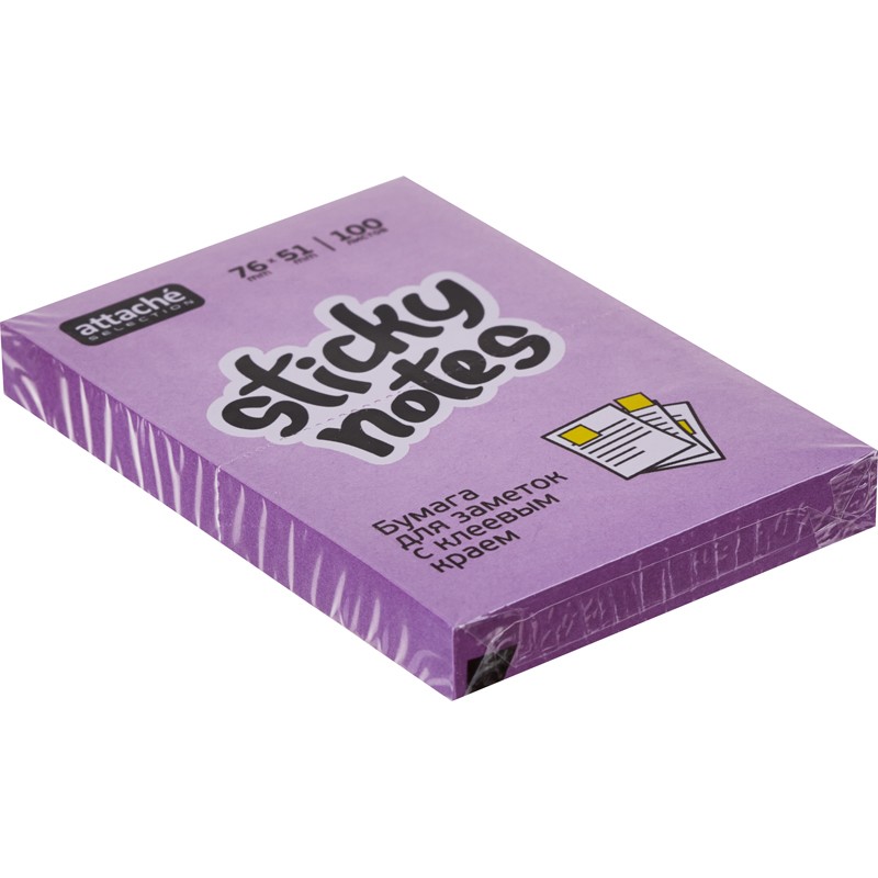 Бумага для заметок с клейким краем Attache. Размер — 76×51 мм, неоновая, фиолетового цвета. Плотность бумаги составляет 75 г/кв.м, клейкий слой — 20 Н/м. В упаковке 100 листов. После удаления бумаги на поверхности не остается следов клеевого состава, лист можно крепить повторно.