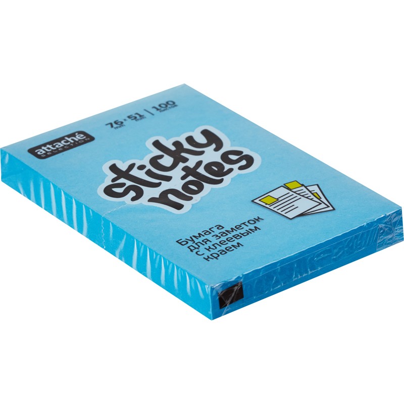Бумага для заметок с клейким краем Attache. Размер — 76×51 мм, неоновая, голубого цвета. Плотность бумаги составляет 75 г/кв.м, клейкий слой — 20 Н/м. В упаковке 100 листов. После удаления бумаги на поверхности не остается следов клеевого состава, лист можно крепить повторно.