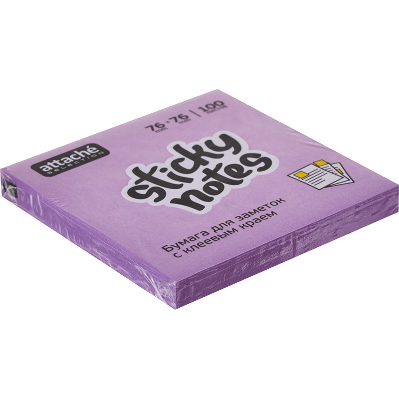 Бумага для заметок с клейким краем Attache. Размер — 76×76 мм, неоновая, фиолетового цвета. Плотность бумаги составляет 75 г/кв.м, клейкий слой — 20 Н/м. В упаковке 100 листов. После удаления бумаги на поверхности не остается следов клеевого состава, лист можно крепить повторно.