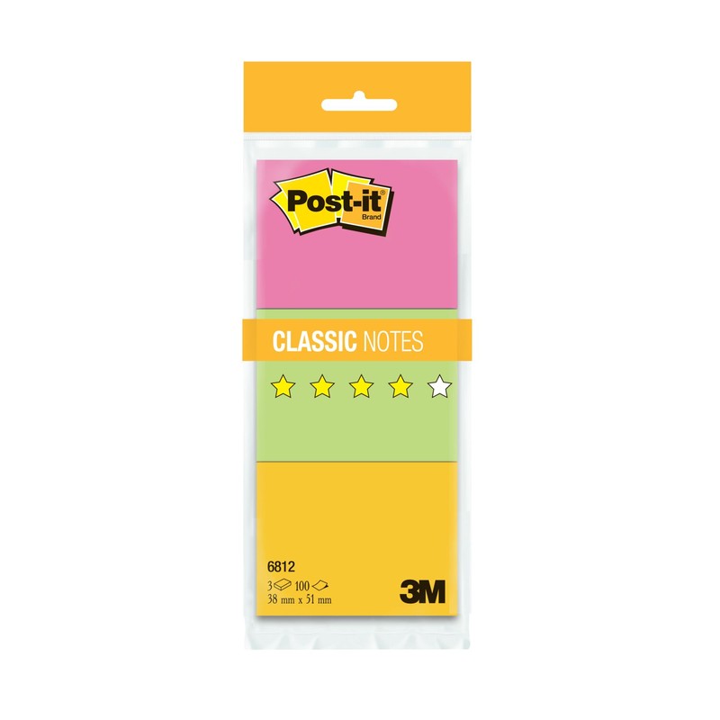 Бумага для заметок с клейким краем Post-it. Размер — 38×51 мм, неоновая, 3 цвета. Плотность бумаги составляет 80 г/кв.м, клейкий слой — 27 Н/м. В упаковке 3 блока по 100 листов. После удаления бумаги на поверхности не остается следов клеевого состава, лист можно крепить повторно.
