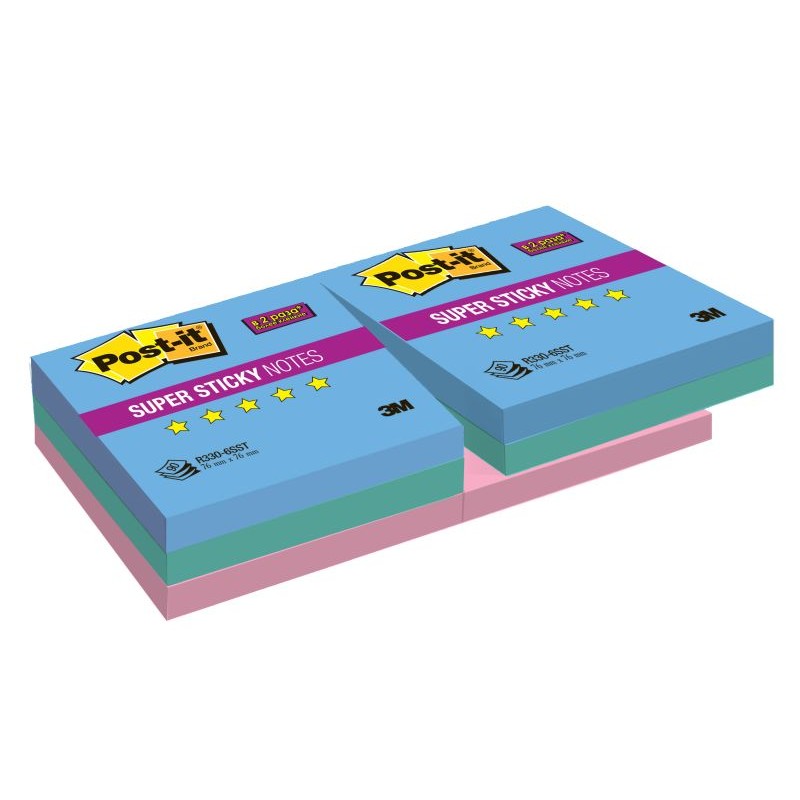 Бумага для заметок с клейким краем Post-it Super Sticky подходит для установки в любые Z-диспенсеры. Размер стикеров — 76×76 мм, 3 цвета, неоновый тон. Плотность бумаги — 90 г/кв.м, клейкость составляет 57 Н/м. В упаковке 6 блоков по 90 листов.