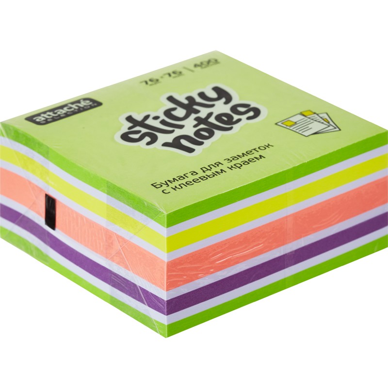 Бумажные стикеры Attache с клейким краем. Размер — 76×76 мм, пастельные и неоновые, 5 цветов. Плотность бумаги составляет 75 г/кв.м, клейкий слой — 20
