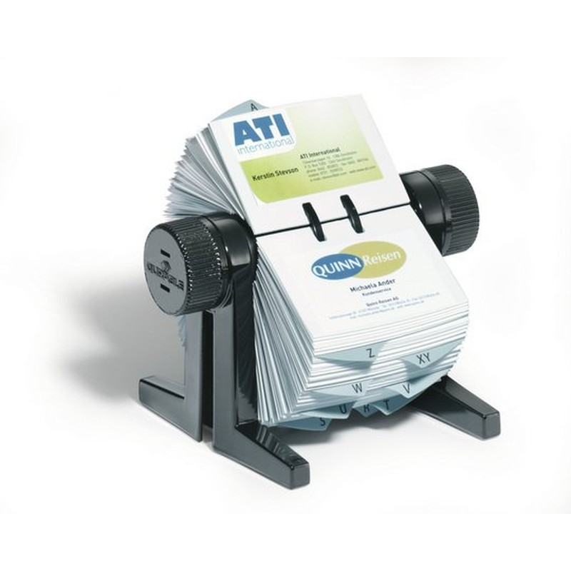 Настольная вращающаяся картотека Durable Visifix Cubo для визитных карточек изготовлена из полимерного пластика черного цвета. Рассчитана на 300 визиток размером 72×104 мм. В комплекте 150 двусторонних съемных карманов и буквенный разделитель A-Z (25 разделов). Размеры картотеки — 215×120×185 мм.