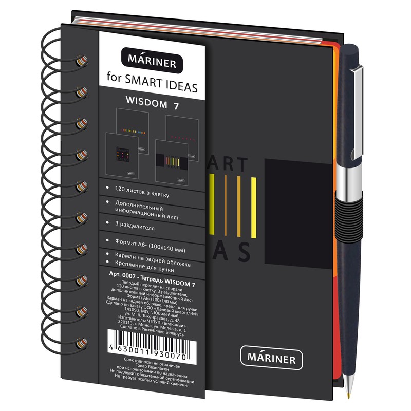Бизнес-тетрадь Mariner Wisdom А6, 120 листов + дополнительный информационный лист. Обложка — твердый переплет на спирали, матовая ламинация + выборочный УФ-лак. Форзац — офсетная бумага черного цвета. Размер внутреннего блока составляет 100×140 мм, бумага плотностью 60 г/кв.м, белизна 100%, клетка, 3 разделителя из картон плотностью 200 г/кв.м. На нижней обложке с внутренней стороны есть кармашек для мелочей, резинка под ручку. Тетрадь поставляется в термоусадочной пленке.