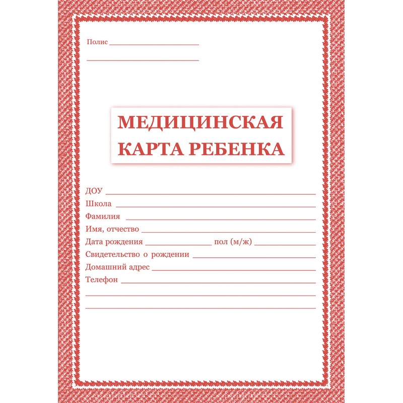 Медицинская карта ребенка по форме N026/У-2000 для детского сада, школы, колледжа — это медицинский документ, который оформляется всем детям при зачислении их в образовательные учреждения или находящимся на воспитании в учреждениях дошкольного, начального общего, основного общего, среднего (полного), общего образования. Предназначена для полного и объективного наблюдения за фактическим состоянием здоровья детей. В периоды дошкольного, а затем и школьного возраста, по фактическим результатам всех обязательных медицинских обследований в детском саду, перед поступлением в первый класс, а затем и в процессе школьного обучения в медицинской карте отображаются все мероприятия по профилактике и лечению. Формат А4, цвет красный.