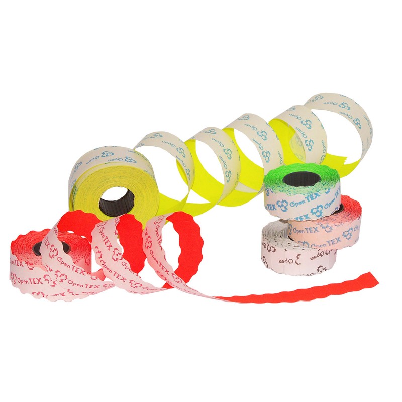 Лента желтого цвета с этикетками прямоугольной формы размером 28×29 мм предназначена для этикет-пистолета Open T117. Этикетки вмещают три строки символов. Поставляется по 10 рулонов в упаковке, один рулон состоит из 700 этикеток.