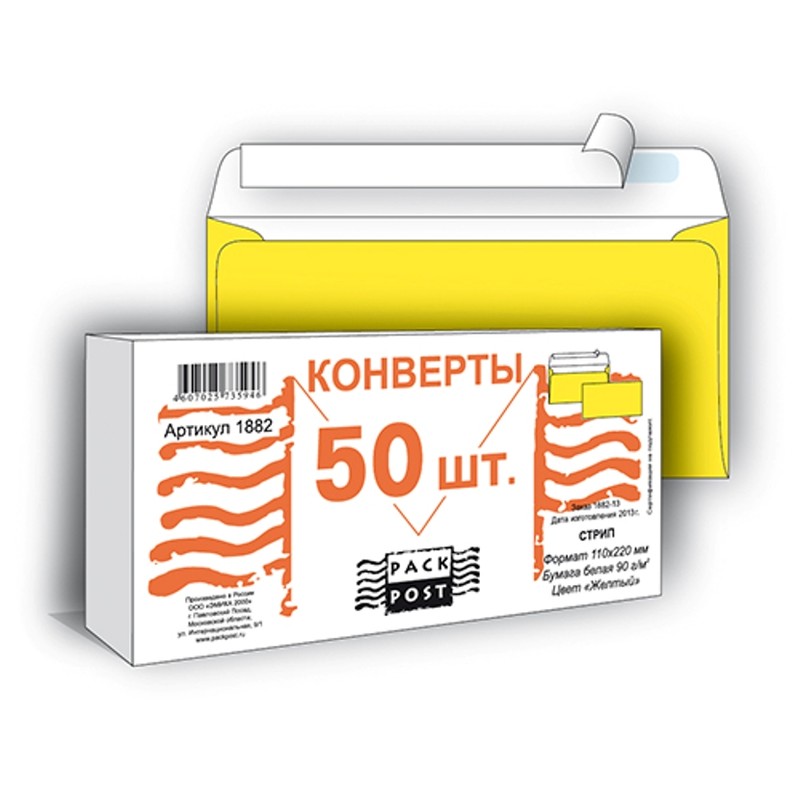 | Конверт Желтый E65 стрип 110х220 90г Пинья 50шт/уп/1882 |