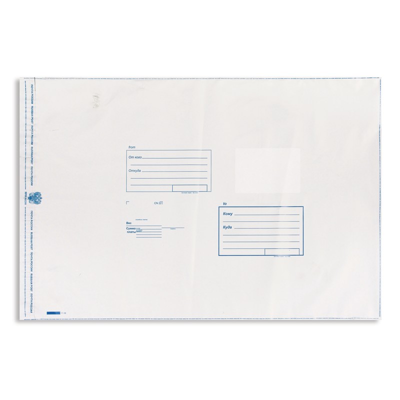 Почтовый пакет формата 360×500 мм изготовлен из трехслойного непрозрачного полиэтилена толщиной 70 мкм. Предназначен для упаковки всех видов почтовых отправлений — писем, бандеролей, мелких посылок (простых, заказных, с объявленной ценностью). Имеет почтовый подсказ «Куда-Кому», снабжен отрывной клейкой лентой. Поверхности определенных зон пакета обеспечивают качество наносимых шариковой ручкой надписей, оттисков штемпелей и не допускают их истирания при обработке и транспортировке.