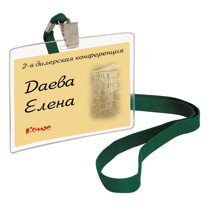 Горизонтальные бейджи Attache размером 120×87 мм имеют металлическую клипсу и тесьму зеленого цвета. Ширина ленты 10мм, длина 850 мм. Предназначены для именной карточки, размером 113 x 70 мм. Изготовлены из плотной прозрачной пленки с эффектом «апельсиновой корки». Поставляются упаковками по 10 штук.