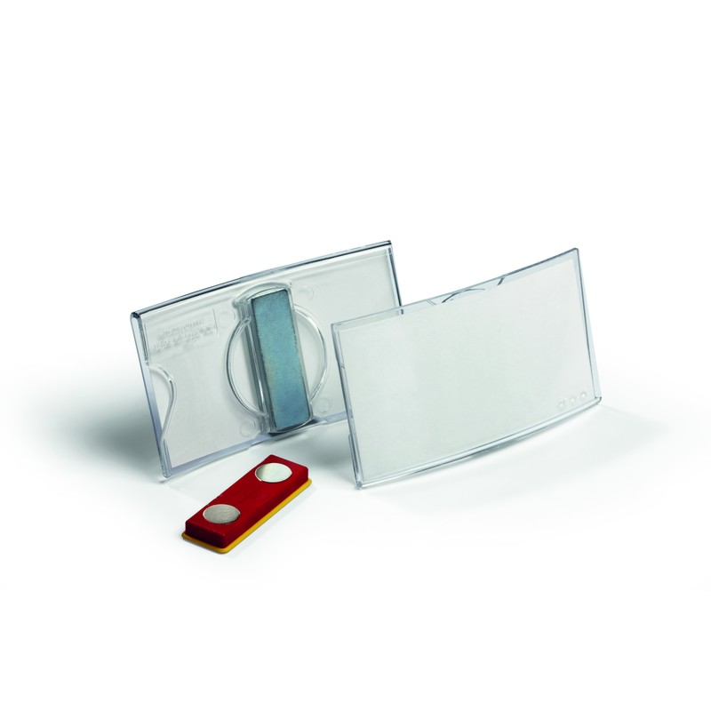 Бeйдж Durablе горизонтального типа изготовлен из выгнутого прозрачного акрила. Предназначен для размещения именной карточки. В изделии в качестве крепежного элемента используется двойной магнитный зажим. Поставляется в упаковке в количестве 25 шт. Размер бейджа — 40×75мм.