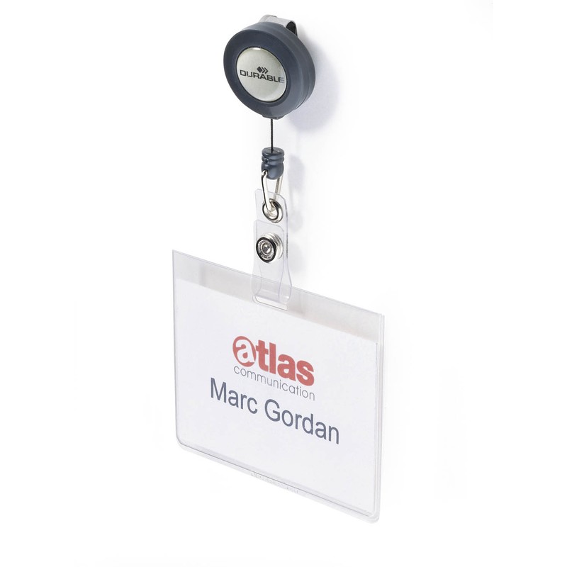 Бейдж Durable горизонтальный применяется для именной карточки. Изделие изготовлено из пластика, используемый тип крепления — держатель, который извлекается по типу «рулетки». Лента черного цвета имеет ширину 0.8мм, длина шнура составляет 60 см. Поставляются по 10 штук в упаковке. Размер бейджа 60×90мм.
