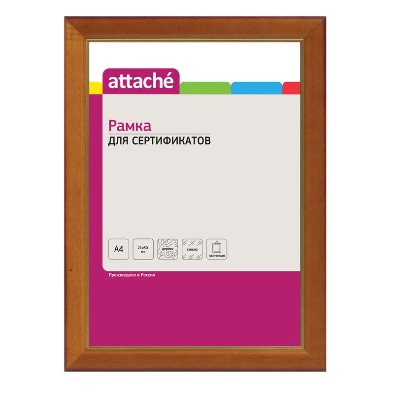 Настенная рамка для сертификатов, дипломов и других демонстрационных материалов Attache имеет размер 21×30 см. Изготовлена из деревянного лакированного багета цвета темный орех с золотистой окантовкой с внутренней стороны. Оснащена защитным стеклом.