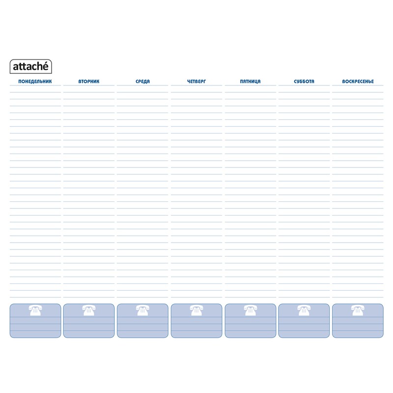 Планинг Attache в обложке голубого цвета. Включает 53 листа из высококачественной офсетной бумаги с перфорацией. Обложка выполнена из плотного картона, который держит форму, снабжена клапаном. На одном листе помещаются записи и даты планирующихся встреч на одну неделю. Листы из офсетной бумаги плотностью 80 гр/ кв.м. Планинг поставляется в индивидуальной полиэтиленовой упаковке. Формат: 575×450 мм.