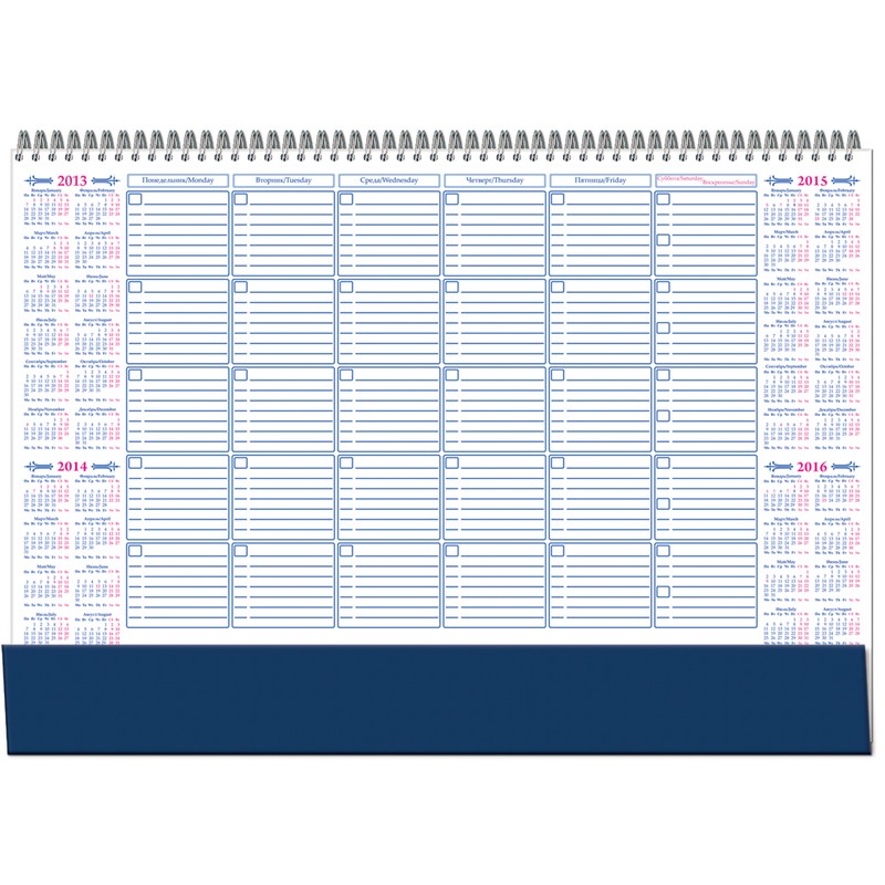 Недатированный настольный планинг-ежемесячник размером 49×35 см состоит из 12 листов офсетной бумаги плотностью 70 г/кв.м, скрепленных металлическим гребнем. Подложка выполнена из плотного картона, есть прижимной клапан синего цвета, на который можно нанести логотип. Обложка отсутствует. На каждом листе — графы для всех дней текущего месяца, календарная сетка на четыре года и поле для заметок. Информационный блок планинга не включает карту мира и карту России.