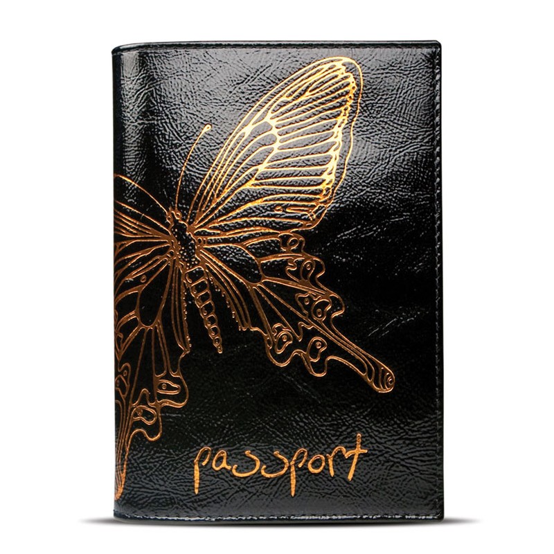 Обложка для паспорта Askent выполнена из натуральной кожи черного цвета. Украшена тиснением из золотой фольги в виде бабочки. Защитит документ от загрязнения и изнашивания. Внутри — два прозрачных пластиковых кармана с выемками. Поставляется в подарочной коробке.