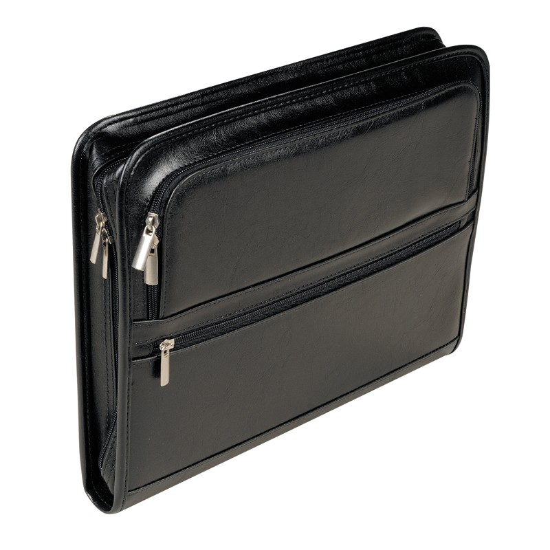 Папка из кож/зам № 163 с ручкой. Материал — искусственная кожа. Два внешних кармана на молнии. Объемное внутреннее отделение и система дополнительных карманов для документов разного формата. Кольцевой механизм на 4 кольца. Комплектуется отрывным блоком для записей формата А4. Размеры: 36×28 см.