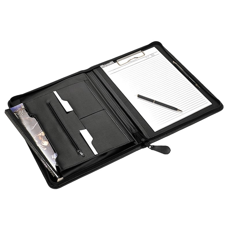 Обновленный вариант папки Лидер. Имеется ручка. Материал — искусственная кожа. Закрывается на молнию. Объемный карман для документов, дополнительные карманы для документов разного формата. Металлический прижим для бумаг. Комплектуется отрывным блоком для записей формата А4. Размеры: 34×22 см.