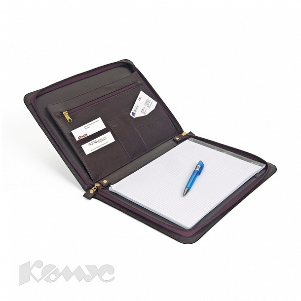 Папка для документов. Материал: натуральная кожа. Внутри есть дополнительные карманы для бумаг, ручек и визиток. Папка комплектуется блоком для записей формата А4. Цвет: коньяк.