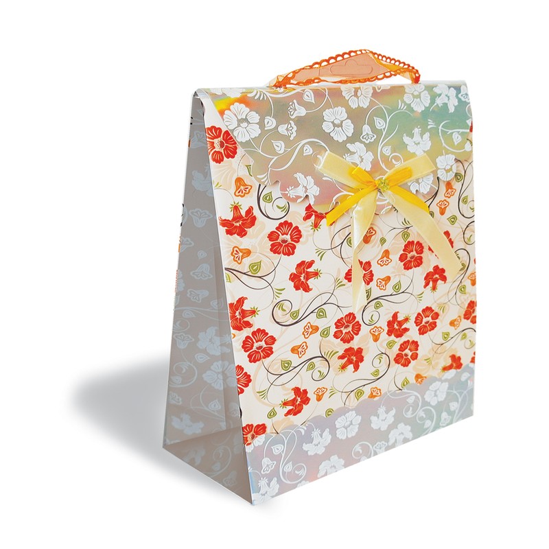 Подарочный пакет изготовлен из плотной бумаги с глянцевым ламинированным покрытием. Декорирован бантом и ленточкой. Дно усилено картонной подложкой, есть ручки для удобной переноски. Размеры подарочного пакета — 19×28 см.