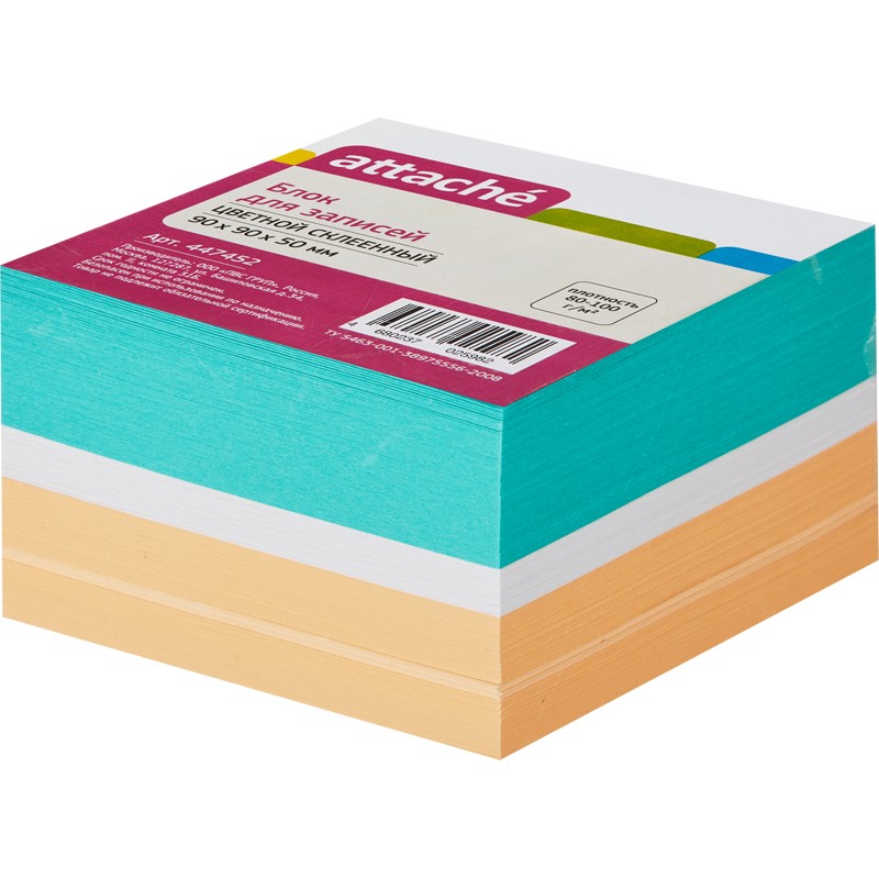 Название торговой марки Attache Торговая марка Attache Размер изделия 90x90x50 мм Страна происхождения Россия Схема вложения 24 Цвет бумаги разноцветные Белизна нет % Артикул 447452 -