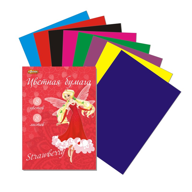 | Бумага цветная №1School,Strawberry,8л,А4,8цв, 80гр |