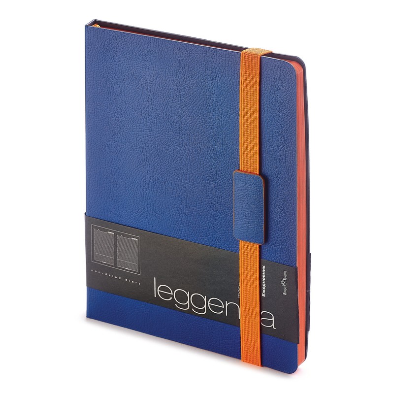 Ежедневник недатированный Leggenda формата B5, размер 170×240 мм. Блок: бумага офсет плотностью 70 г/кв.м, ляссе, закругленный угол обложки. Справочная информация на 16 страниц. Широкая резинка с бегунком из термостойкого материала для персонализации. Количество листов — 136.
