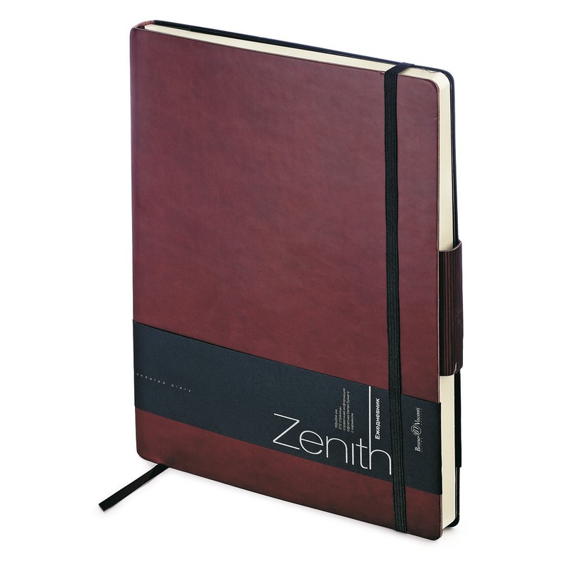 Ежедневник недатированный Zenith формата В5, размер 169×246 мм, 272 страницы, бежевые листы, скругленный угол, обложка из искусственной кожи с имитацией рельефа натуральной кожи, закладка, обрез белый, на резинке. Высококачественная бумага в блоке плотностью 70 гр./кв. м., ляссе. Справочная информация — 15 страниц. Есть конверт для визиток. Количество листов — 136.