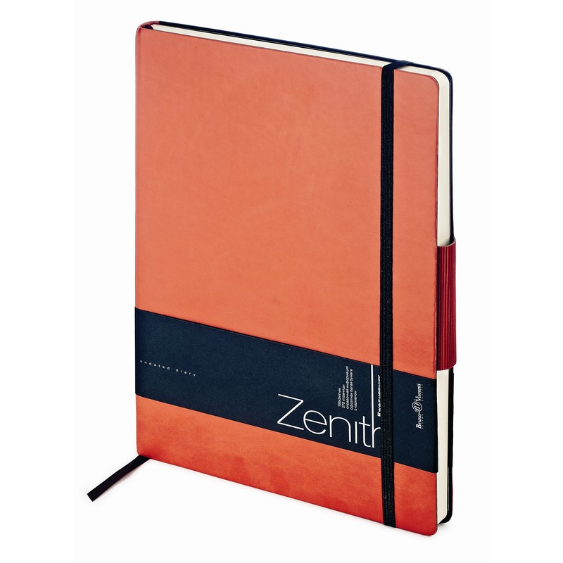 Ежедневник недатированный Zenith формата B5, размер 169×246 мм. Бежевые листы, скругленный угол, обложка из искусственной кожи с имитацией рельефа натуральной кожи, закладка, обрез белый, на резинке. Высококачественная бумага в блоке плотностью 70 г/кв.м, ляссе. Справочная информация — 15 страниц. Есть конверт для визиток. Количество листов — 136.