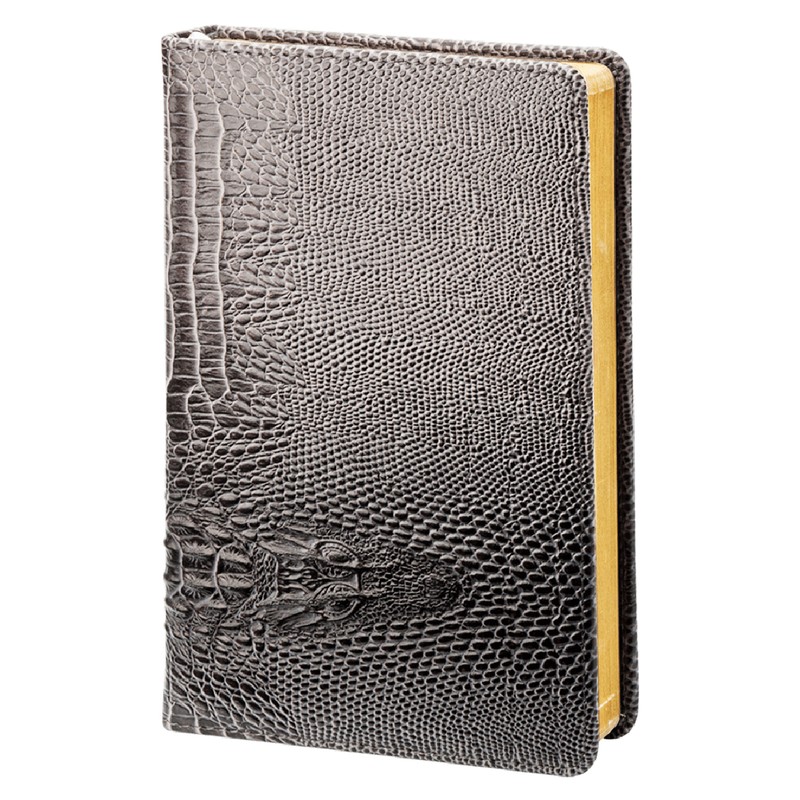 Ежедневник недатированный относится к коллекции Dandy формата А5, размер 140×200 см, Искусственная кожа с фактурой «под крокодила» с фактурой головы крокодила на обложке, тип обложки — твердый с мягкостью. Блок: тонированная бумага, золотой обрез, 2 ляссе, внутри кармашек, серого цвета. Количество листов — 160.