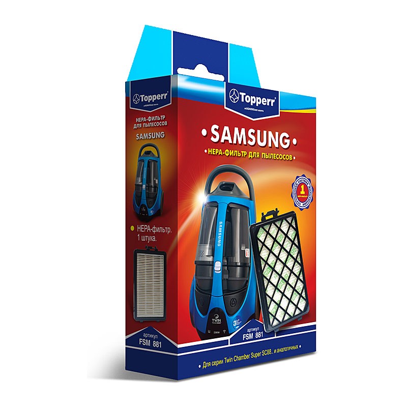 HEPA-фильтр FSM 881 для пылесосов SAMSUNG. Обладает высочайшей степенью фильтрации, задерживает 99,5% пыли. Благодаря специальным свойствам фильтрующего материала, фильтр улавливает мельчайшие частицы, позволяя очищать воздух от пыльцы, микроорганизмов, бактерий и пылевых клещей. Тип оригинального комплекта фильтров SAMSUNG: DJ97-01670D. Подходит для арт. 367030, 517244, 517248