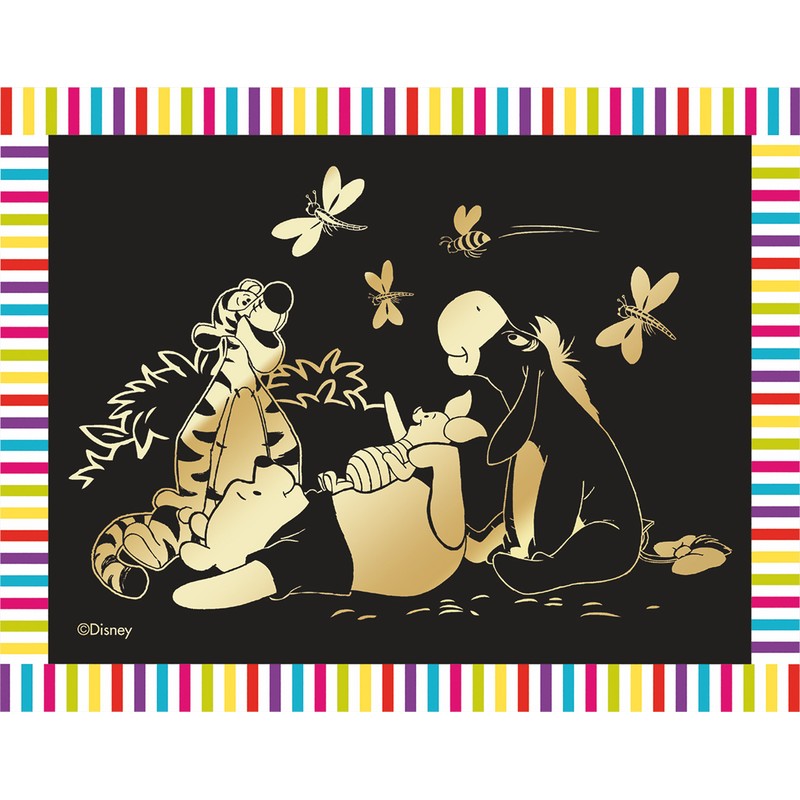 Большая гравюра «Винни и его друзья. Летний день» с изображением героев мультфильма Disney, предназначенная для детского творчества. Для создания изображения с эффектом позолоты необходимо сцарапать поверхностный слой специальным штихелем, имеющимся в комплекте. Получившуюся гравюру можно поместить в упаковочную рамку. Размер — 180×240 мм.