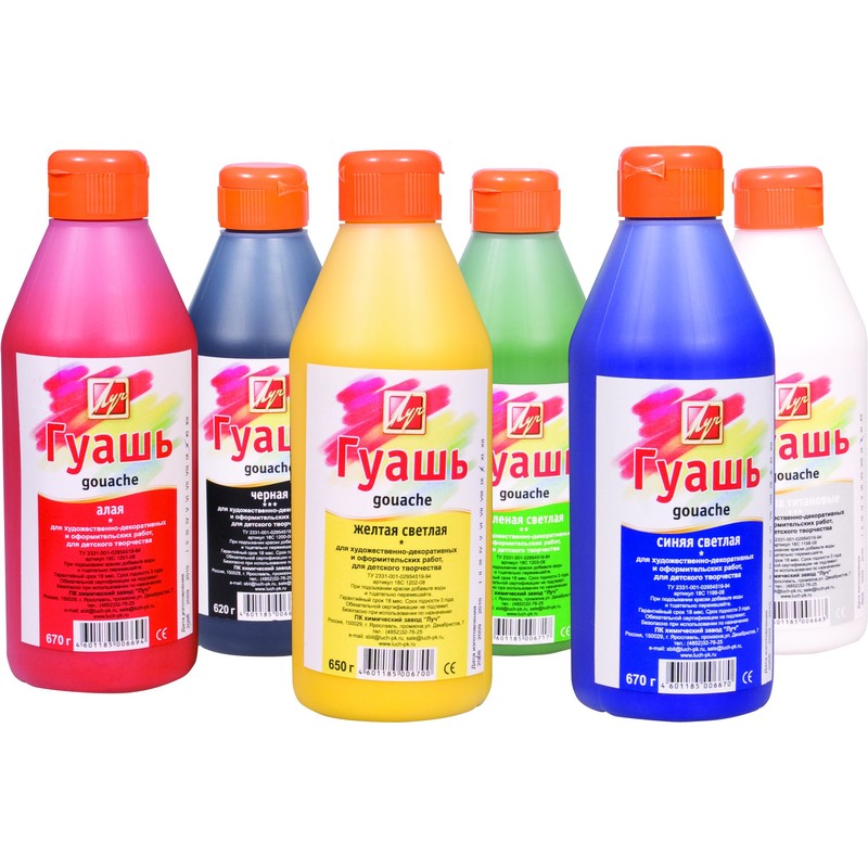 Наряду с баночками классическая гуашь поставляется во вместительных пластиковых бутылках (500 мл). Бутылка снабжена удобной крышкой с контролем дозировки краски. Алая гуашь изготовлена на основе натуральных компонентов и высококачественных пигментов с добавлением консервантов, не содержащих фенола. Предназначена для детского творчества, художественных, оформительских, рекламных, декоративно-прикладных работ.