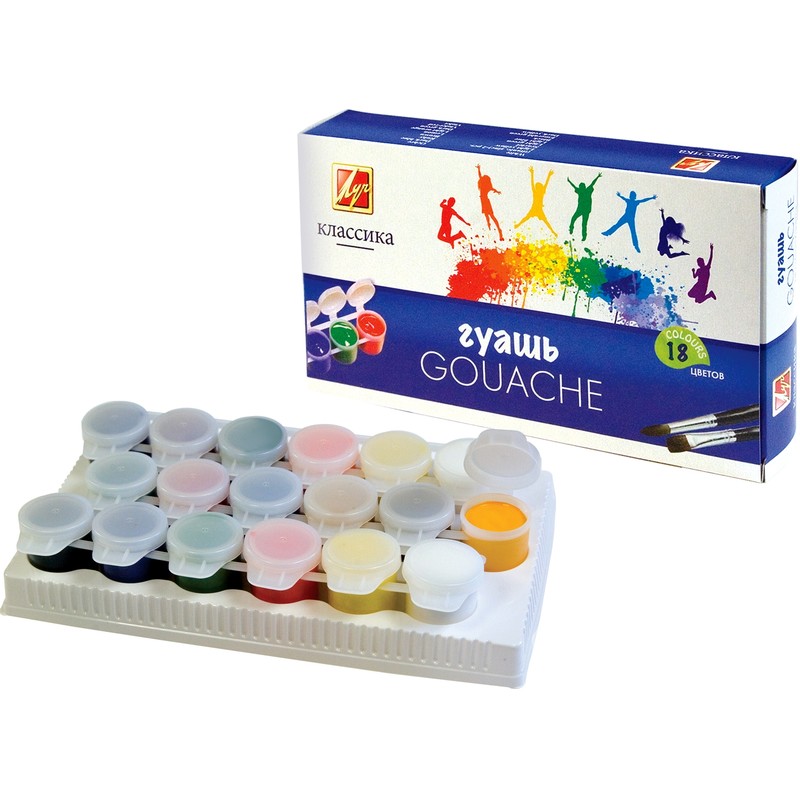 В набор «Классика» входят гуашевые краски 18 цветов. Предназначены для детского творчества, художественно-декоративных, оформительских работ. Изготовлены на основе натуральных компонентов и высококачественных пигментов. Гуашь находится в герметичных пластиковых баночках объемом 20 мл. При необходимости разбавляется водой, безвредна, быстро высыхает, легко смывается с рук.