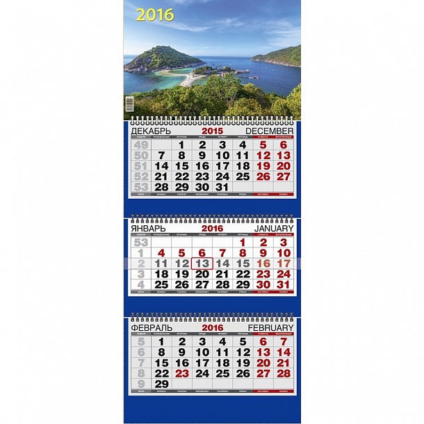Трехблочный календарь на 2016 год "Тихая бухта" размером 31х71 см состоит из красочного постера и трех блоков. Постер изготовлен из мелованного картона с лакировкой. Каждый блок имеет размер 29,5х14,5 см, включает 12 листов офсетной бумаги плотностью 70 г/кв.м, закрепленных на металлическом гребне. Текущую дату удобно выделять с помощью <курсора> в виде прямоугольного окошка, которое свободно перемещается на пластиковой направляющей. Календарь поставляется в европакете с подвесом.