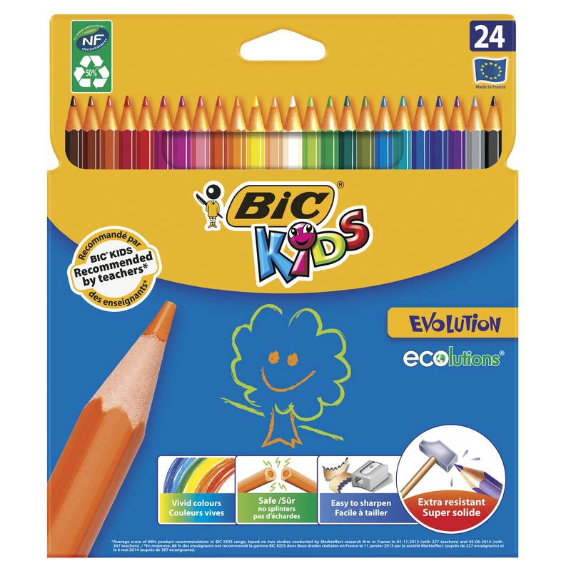 Карандаши цветные 24цв 6-гран BIC - ультрапрочные цветные карандаши, не содержащие древесины. Сертифицировано эко-статусом NF Environment. На 50% сделаны из переработанных материалов. Идеальны для ежедневного использования маленькими художниками от 5 лет. Ультрапрочный стержень. Не образуют острых краев на изломе. Безопасны для тех, кто любит грызть карандаш. Очень легко точится. Широкий выбор цветов: 24 ярких живых цвета. Цветной стержень толщиной 3.2 мм обеспечивает хорошую степень закрашивания