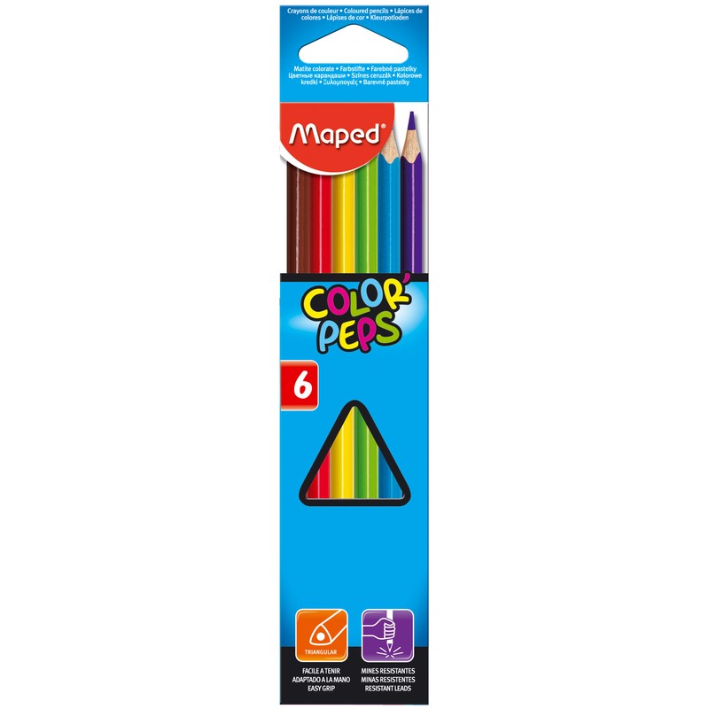 Набор цветных карандашей Maped Color’peps, 6 штук. Яркие, насыщенные цвета, трехгранная форма для удобного захвата, прочный, легко затачиваемый корпус из древесины американской липы. Ударопрочный и одновременно мягкий грифель, диаметр 2,8 мм, длина каждого карандаша 17,5 см. Упаковка из твердого красочного картона с подвесом и «окошком».