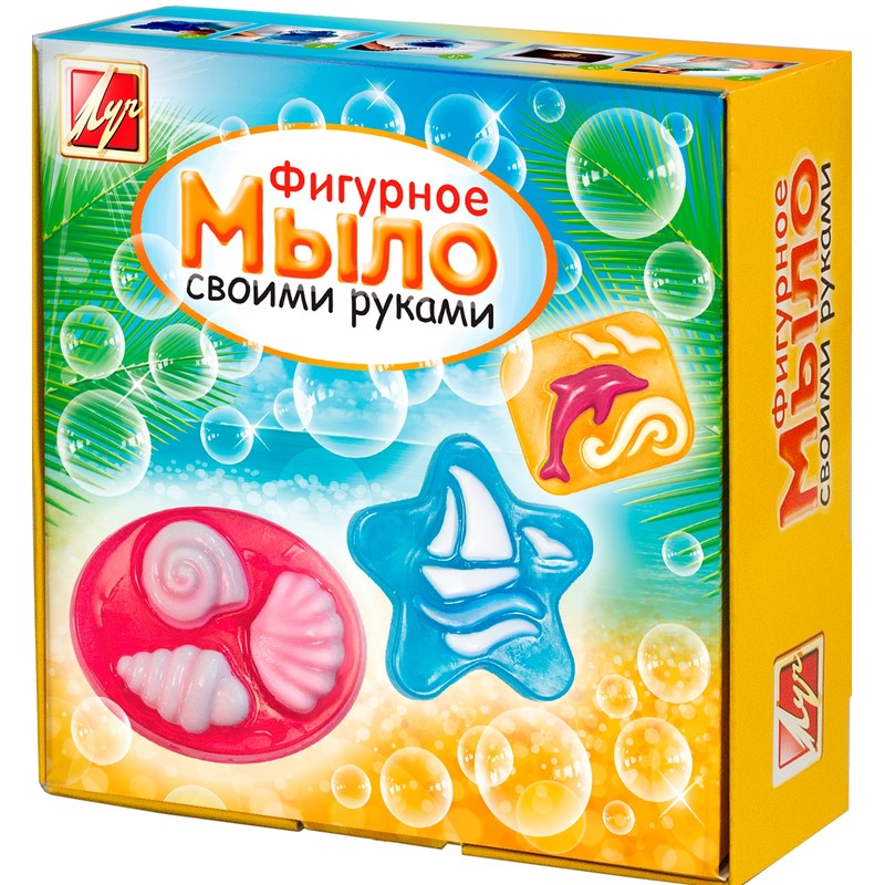 Набор для изготовления мыла «Море». Основа помещается в специальный стаканчик, в котором ее нужно расплавить на водяной бане или в микроволновке. В жидкость добавляются нужные отдушки и красители, после чего смесь заливается в формочку. Дать мылу остыть минут 10, после этого оно готово к использованию. В комплект входит 200 г мыльной основы, отдушки, красители, формочки, палочки для размешивания, инструкция. В наборах есть пищевые красители