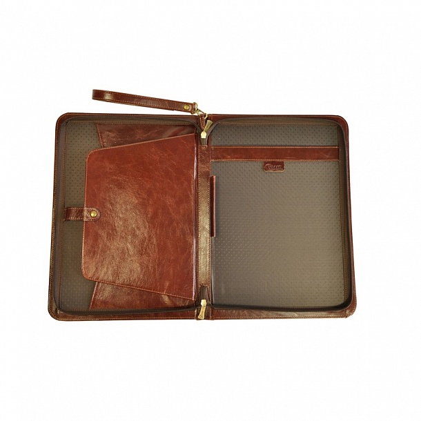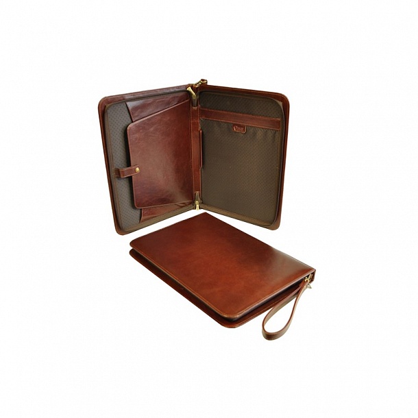 Папка деловая кожаная цвета темный коньяк закрывается на молнию. Имеет внутренний объемный карман с цупфером, карандашник, а также горизонтальный карман для блока для записей. Снабжена малой ручкой-петлей. Размеры деловой папки — 380×260×30 мм.