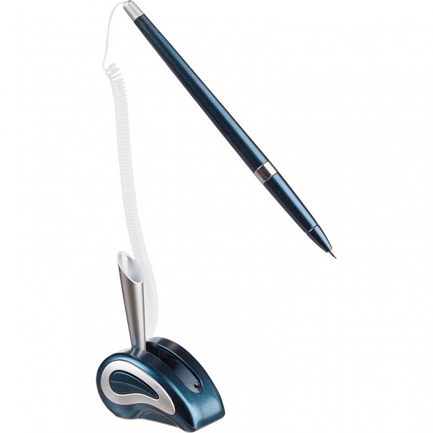 Шариковая ручка на подставке с синим цветом чернил с клейким основанием для крепления к горизонтальным и вертикальным поверхностям. Модель в синем металлизированном корпусе с деталями серебристого цвета специально разработана для офисов и различных учреждений. Толщина линии стержня составляет 0,5 мм.
