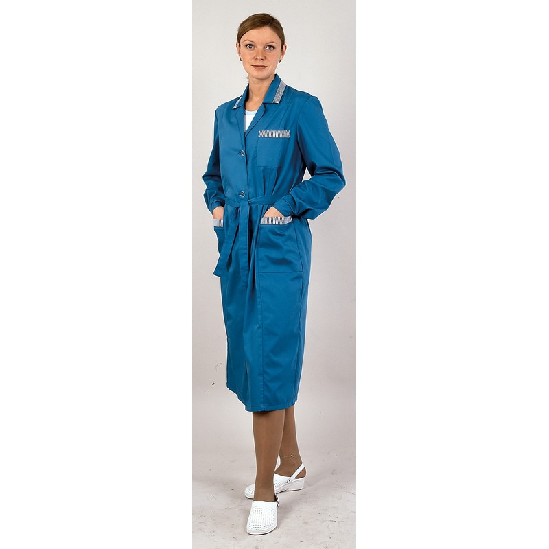 Женский халат для торговли и сферы обслуживания «Вилора», размер 64-66, рост 170-176 см. Изготовлен из ткани бирюзового цвета, состав — 65% полиэфира и 35% хлопка. Рукав длинный. Воротник отложной с лацканами, есть накладные карманы. Отлет воротника, верхние части карманов и края рукавов отделаны светлой тканью. Халат застегивается на пуговицы.
